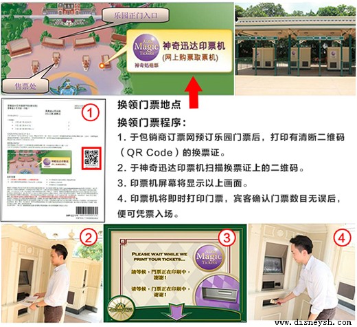 注:7月10日起订购的迪斯尼乐园电子票确认函上会加上一枚二维码(QR Code),宾客 凭换票证的打印件,可于乐园开放后至关门前1小时期间,到神奇迅达印票机扫描换票证上 的二维码领取门票,无需到售票处排队(7月10日前出票的迪斯尼电子票的兑换流程不变, 票面没有二维码的迪斯尼电子票确认函,不能使用印票机领取门票)。 换领地点和换领流程: ![]() |